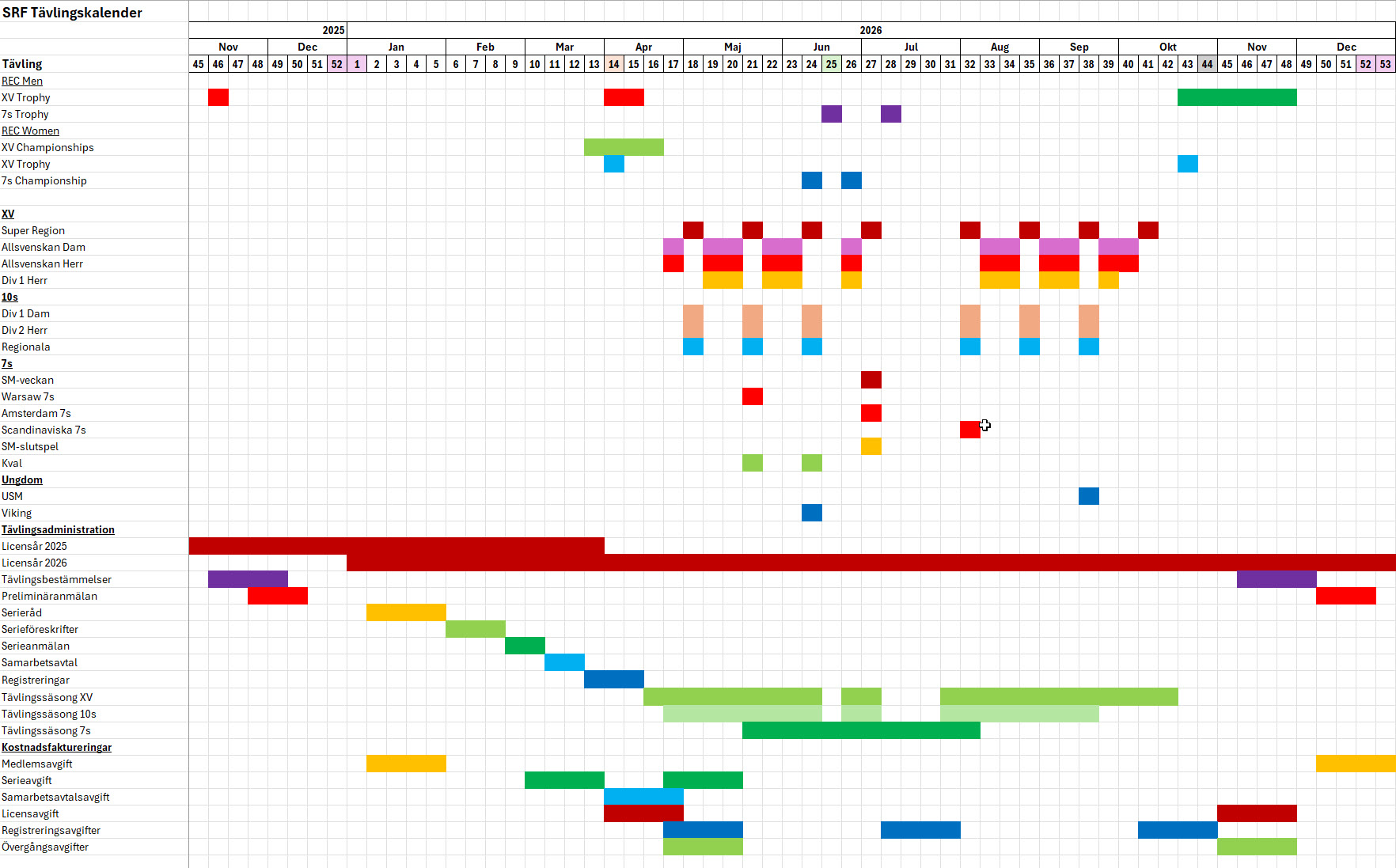 Den innehåller spelhelger för landslag och seriematcher samt tider för tävlingsadminstration som uppdatering bestämmelser, anmälningar mm.